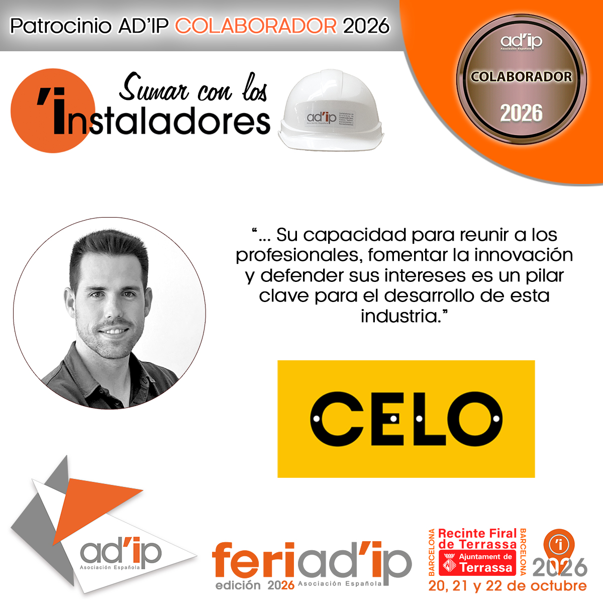 CELO, mediante un Acuerdo adicional a su Patrocinio, confirma su presencia con un espacio expositivo en la que será la sexta edición del Gran Punto de Encuentro Especialista del sector, FERIAD’IP Edición 2026, habiendo estado presentes y ofreciendo su apoyo a la representación sectorial del Instalador también en FERIAD’IPEdición 2025, en FERMASA. Este Evento nació con vocación de celebración anual e itinerante por todo el territorio español, desde la responsabilidad de AD’IP Asociación Española como representación sectorial en España de su Perfil Profesional del Instalador, y destacando su gran labor y apuesta por la Formación de nuevos Profesionales, siendo Proyecto Finalista en los Premios Alianza para la FP Dual 2024, en la categoría de Organizaciones.