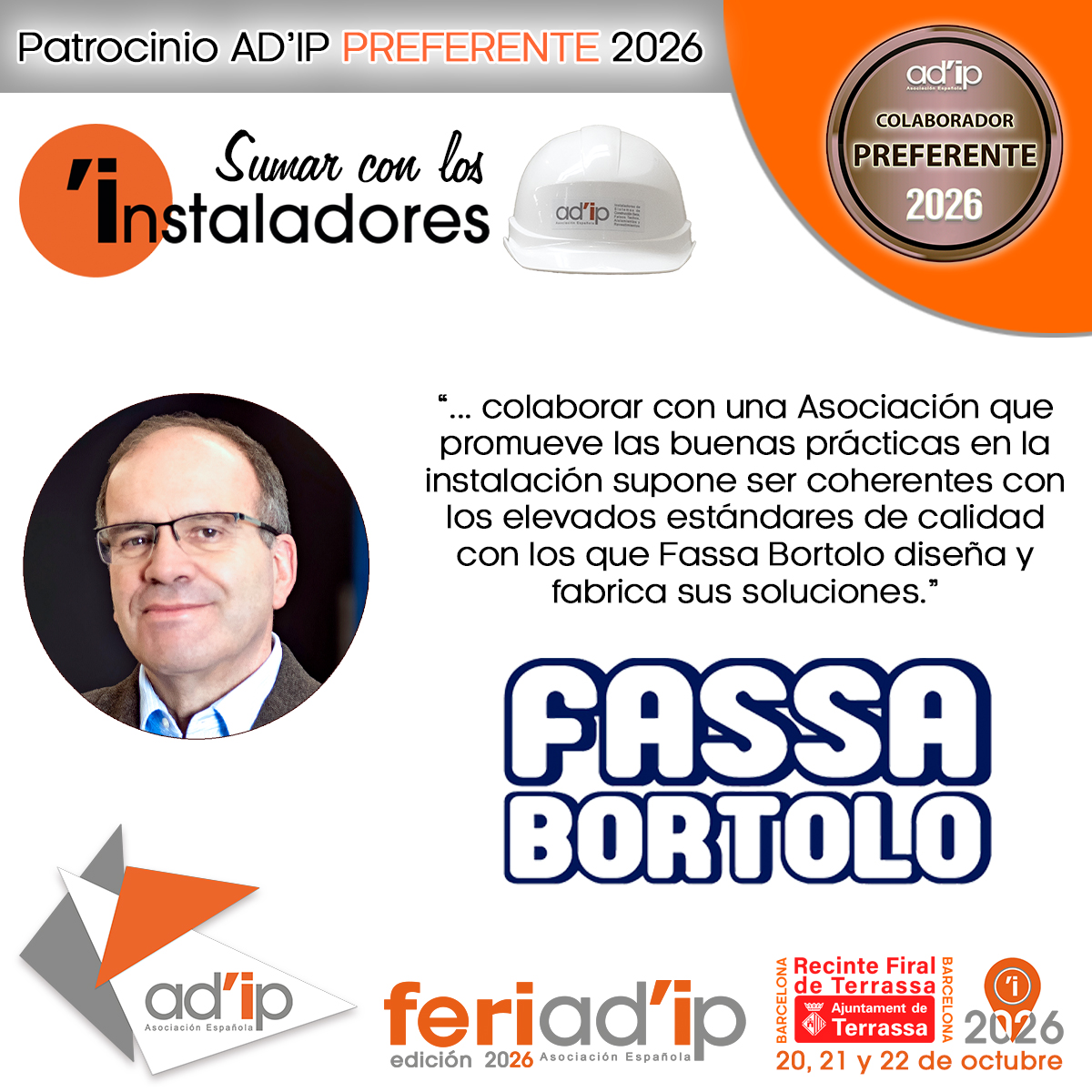 “Desde Fassa Bortolo valoramos muy positivamente el trabajo que realiza AD’IP Asociación Española, ya que contribuye a poner en valor la profesionalidad del Instalador y la correcta ejecución de los sistemas constructivos.